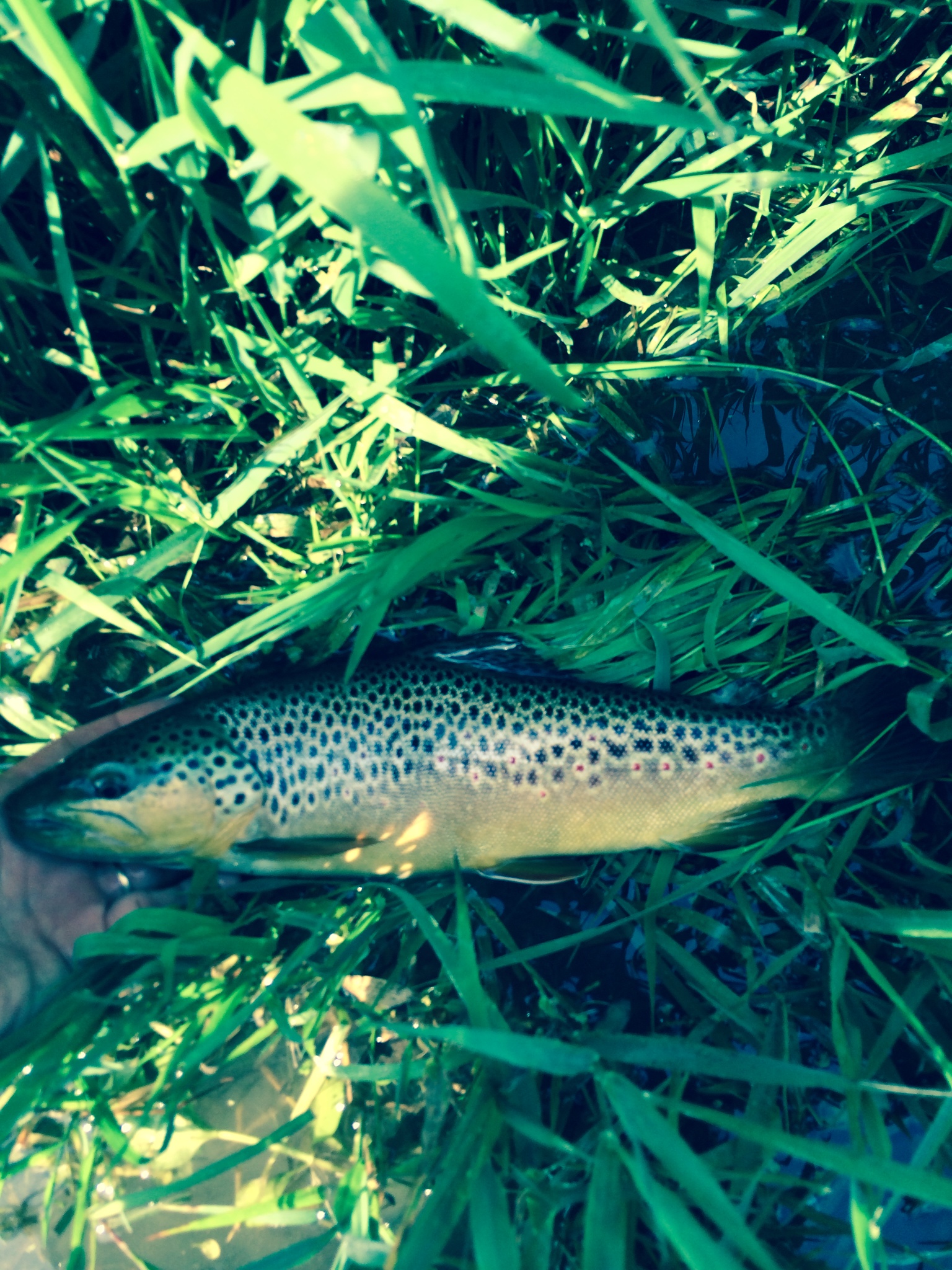 I decided to go back there today. After 3 phone calls to Craig, I found the exact tree where he found some rising fish and also where he broke off…..and a few fish rising just like he said. As it frequently happens on the heritage section of the Falling Spring, the fish shut down after several casts….. even with 12 feet of leader tied down to 7X and a size 28 gray hackle midge. So, I waited. Finally, another rise and I was back in business. This time, a 16″ Brown cooperated. Now the rest of the story.