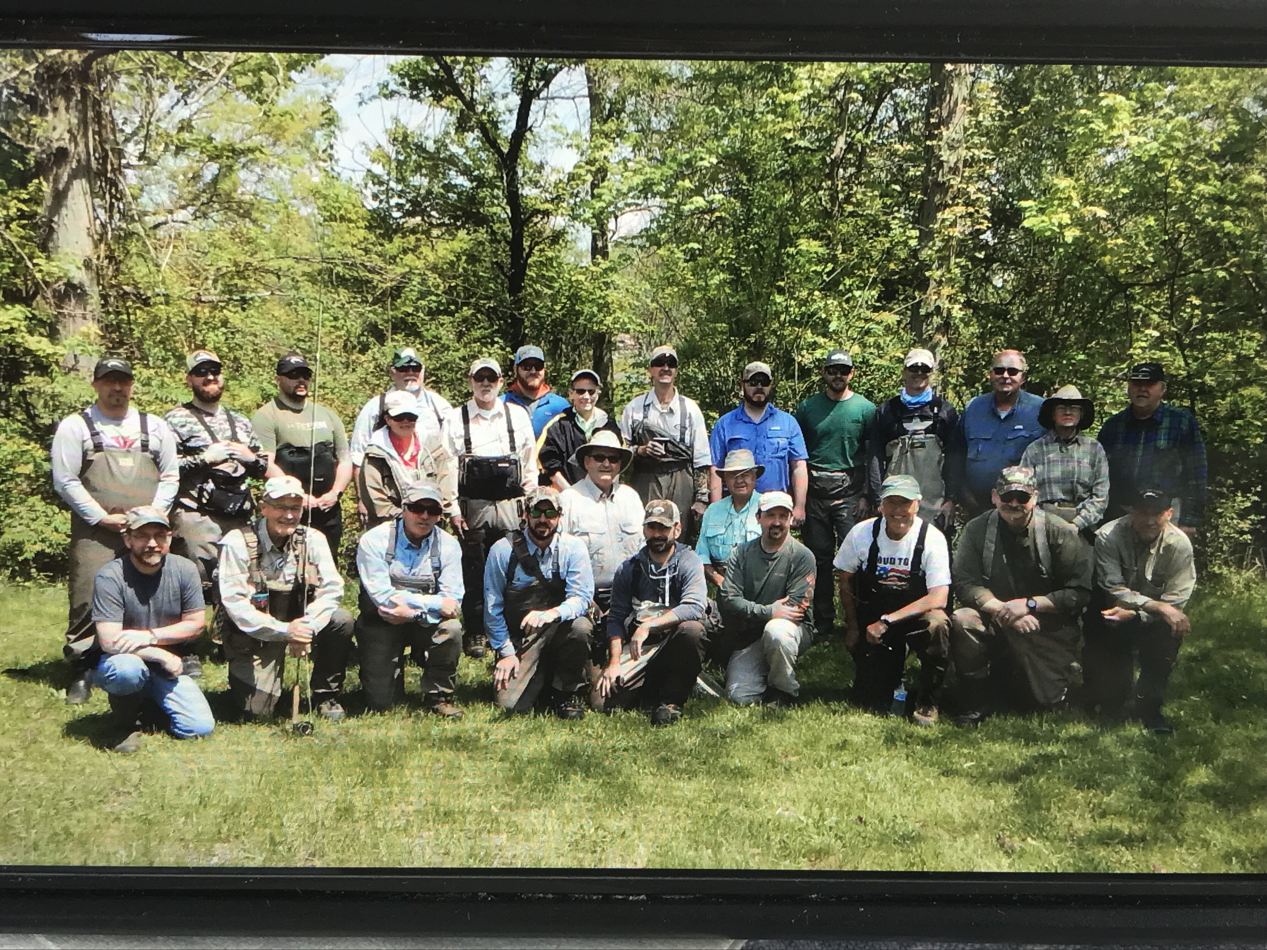 The day started with coffee and doughnuts at Walton’s Meadow in Chambersburg. A nice fishing bag with flies was presented to each “Warrior”( donated by the Fly Shack). After that, they were each assigned a fishing companion to take them either on the Conococheague Creek or the Falling Spring. Morning and afternoon fishing was broken up by a barbecue at the Meadows.